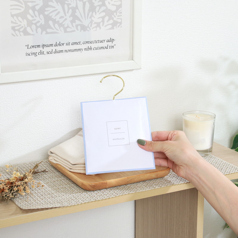どこにでも吊り下げられるハンガー付きなので、場所に困りません。ドアノブやクローゼットなどに掛けて香りを楽しんで♪