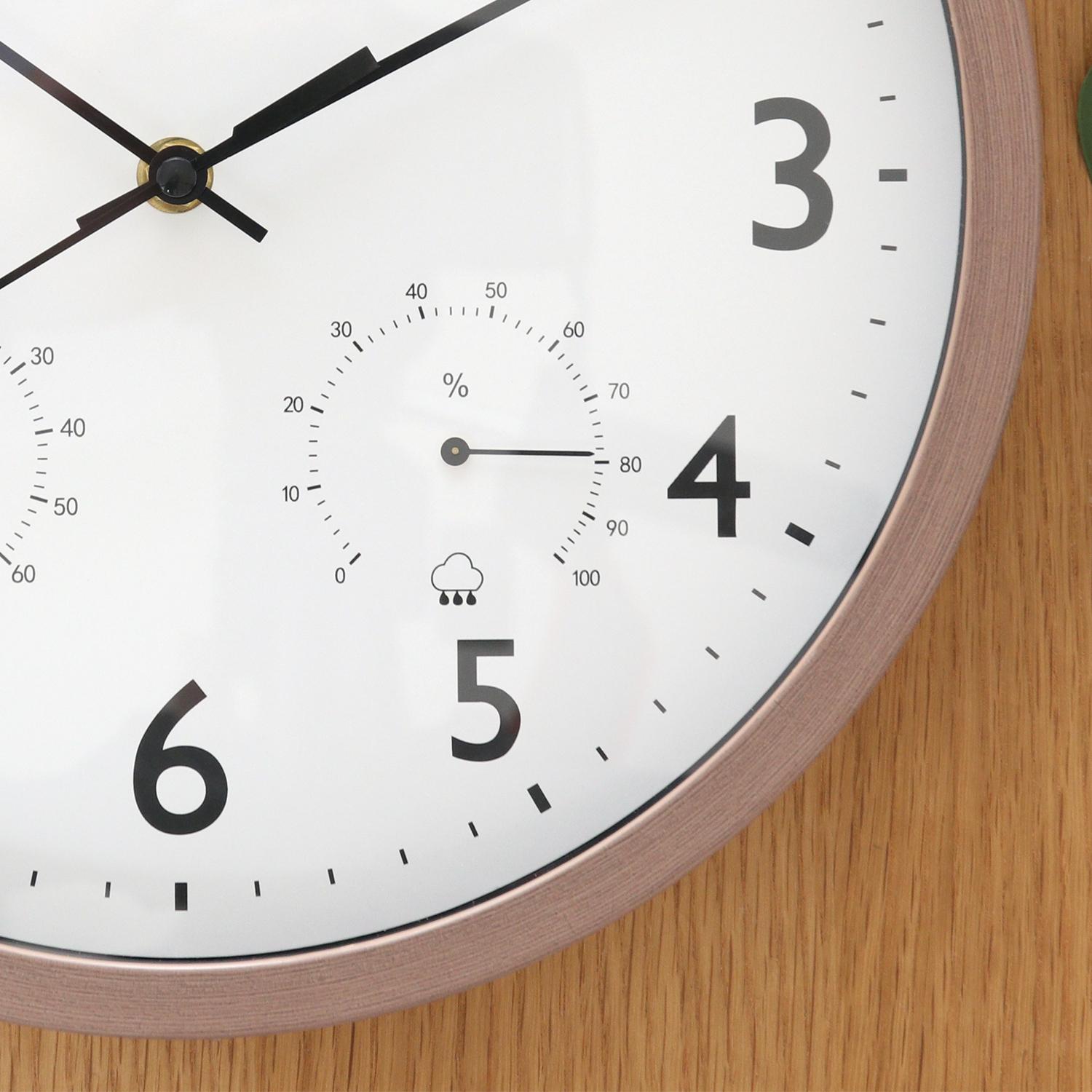 文字盤の左右には温度計と湿度計が付いており、お部屋の環境チェックが可能。室内での熱中症対策にも活躍!