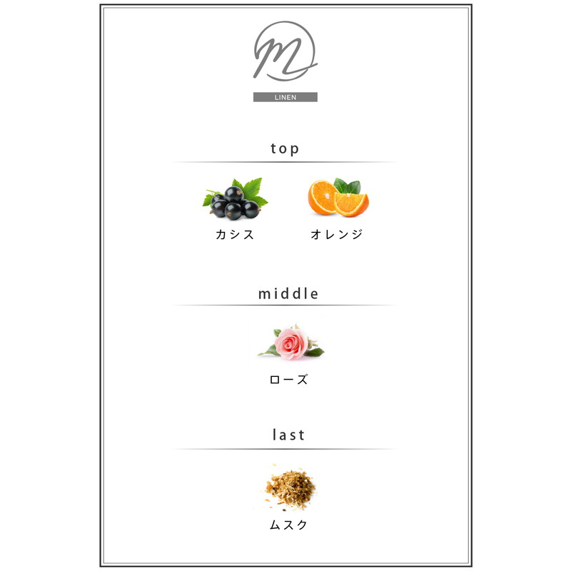 洗い立てのリネンのような柔らかい香り。TOP:オレンジ・カシス、MIDDLE:ローズ、LAST:ムスク