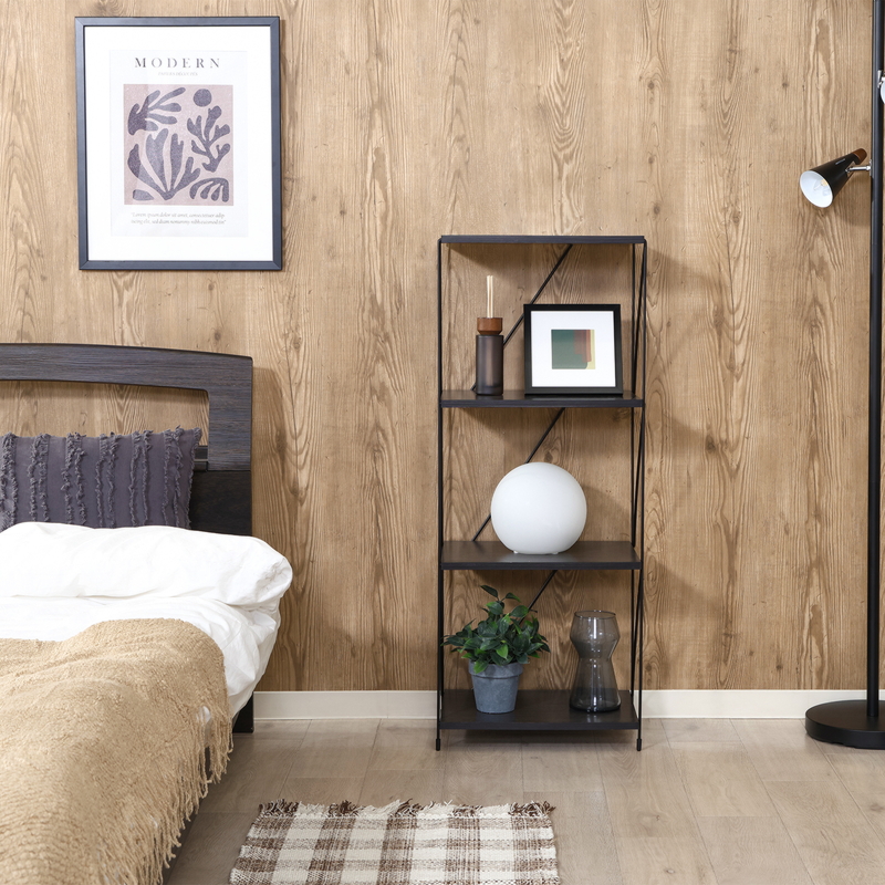 木目調の棚板とスチールのワイヤーフレームで、空間をカッコよく見せてくれます。斜めにつけるスチールはお好みの向きに付けることができます。