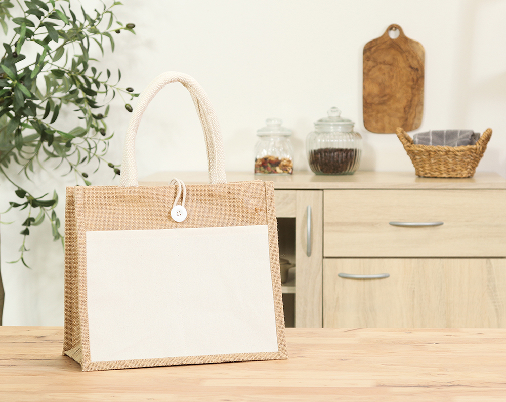 ワンポイントのポケットがかわいいボタン付きジュートバッグ Sサイズ