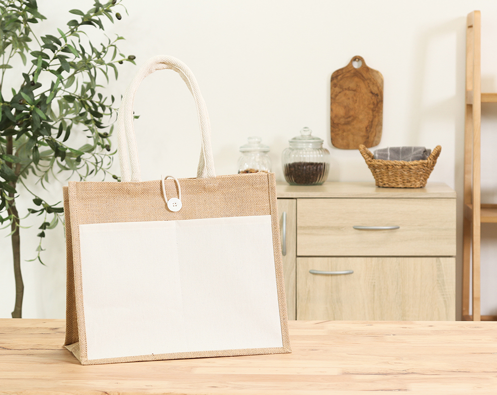 ワンポイントのポケットがかわいいボタン付きジュートバッグ Mサイズ