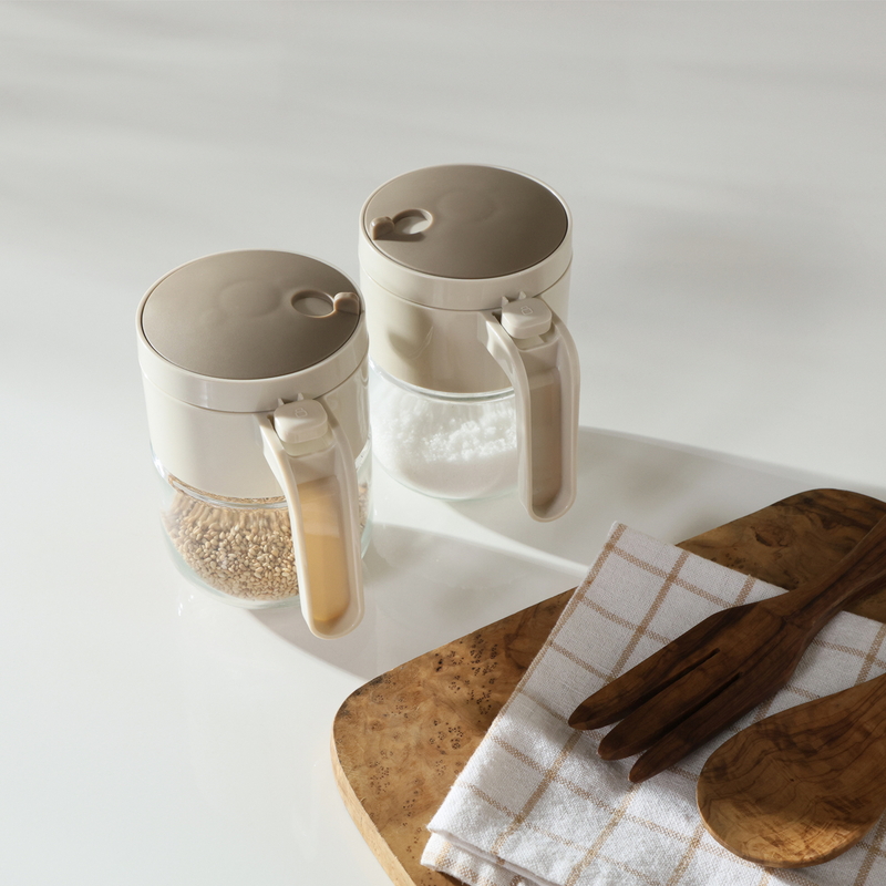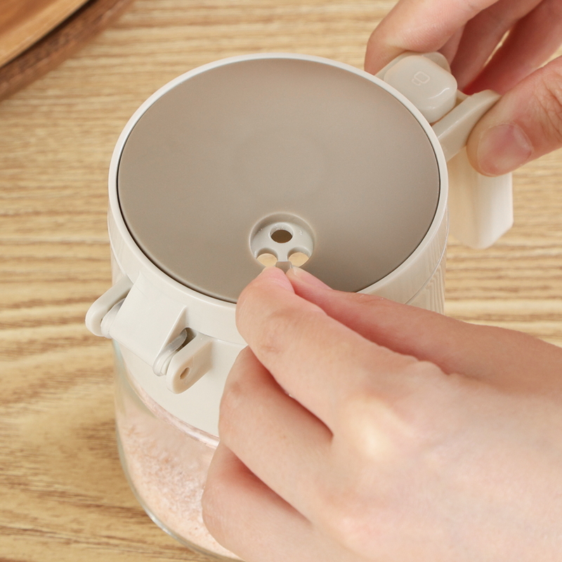 蓋には3種の振り出し口付き。塩やごまなどのトッピングにも最適で、詰め替えずにそのまま使えます。