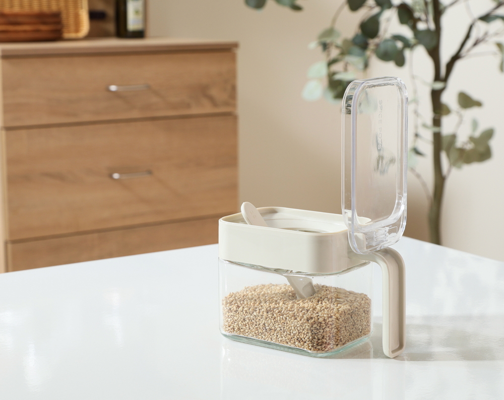 スプーンは本体の内側にある独立した収納スペースにスッと収まります。調味料に触れずしまえるから、清潔&見た目もすっきり。