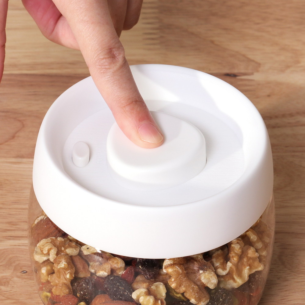 フタをしっかりと閉め、真ん中の大きなボタンを複数回プッシュ!キャニスター内の空気が抜けて真空状態をつくります。