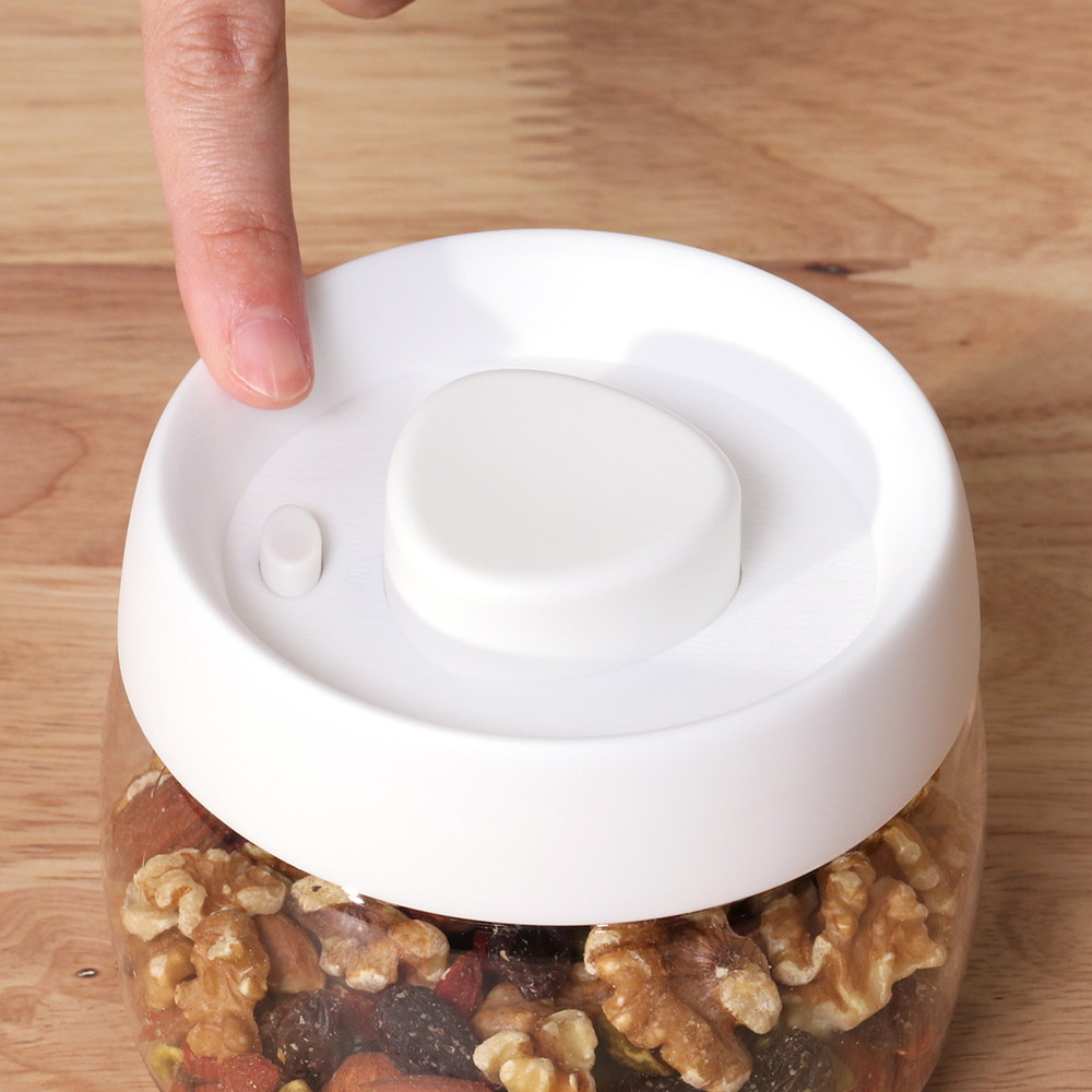 真空状態のキャニスターを開ける際はフタについた小さなボダンを押すとキャニスター内に空気が入り込み、密閉を解除できます。