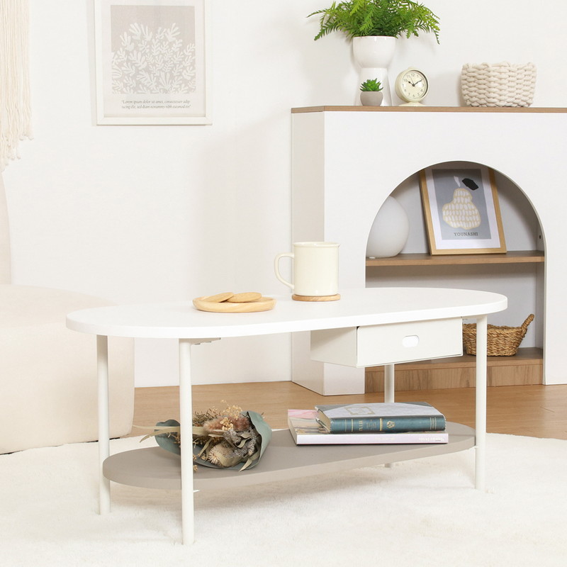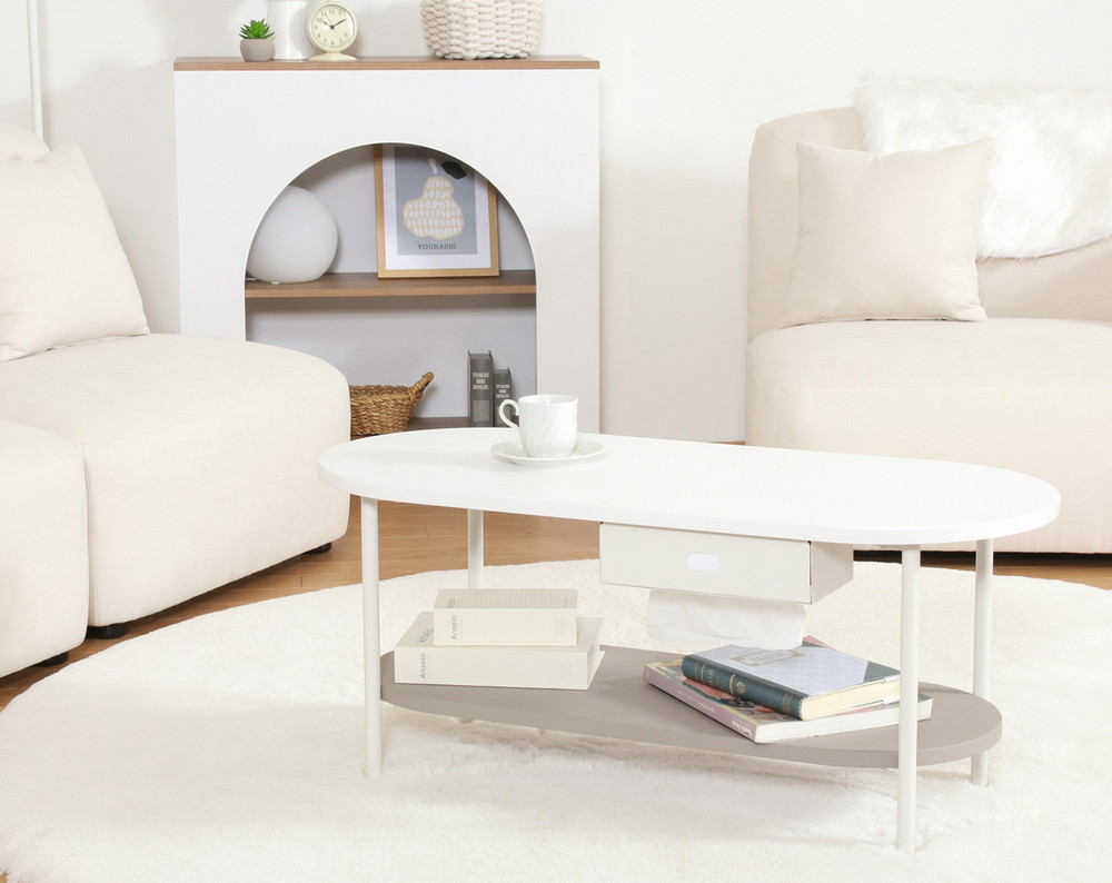 【材質】■構造部材(天板・棚板):合成樹脂化粧繊維板(MDF) ■構造部材(脚部・ティッシュ収納):金属(鋼) ■表面加工(脚部):粉体塗装(エポキシ樹脂塗装)