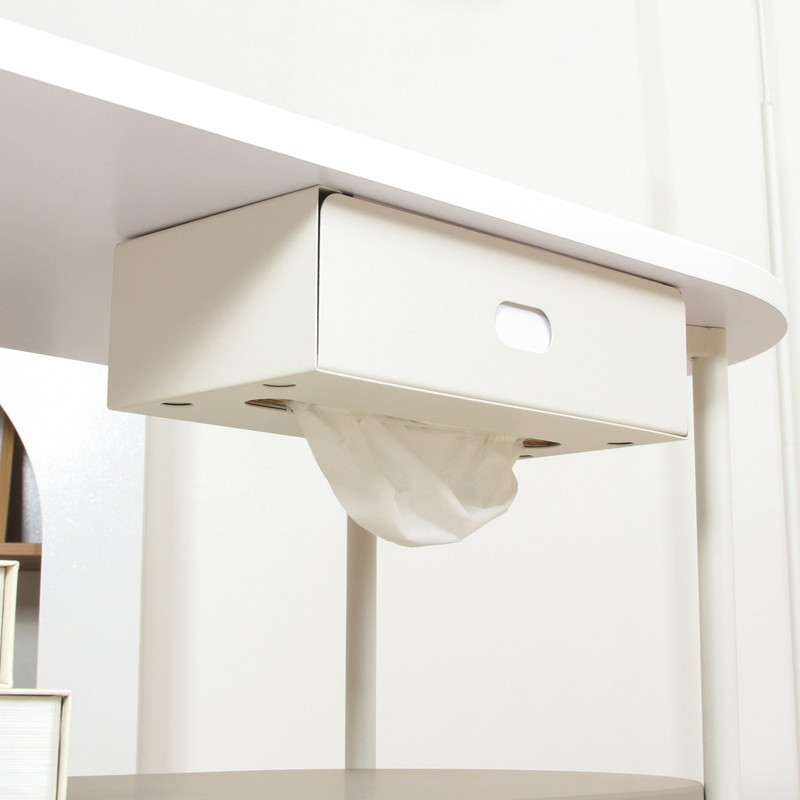天板裏にティッシュ収納ケースを付属。手の届く場所にスッキリ収めることができ、より快適に!