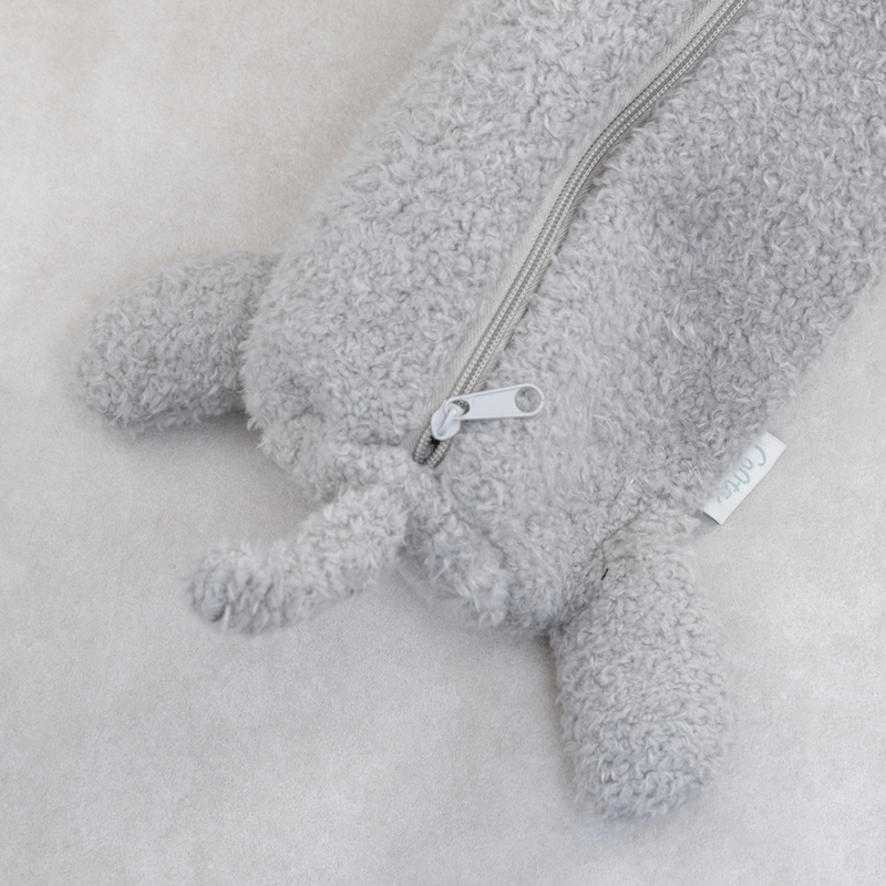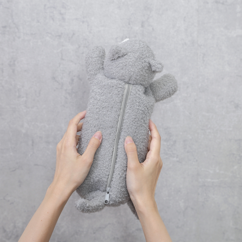 ボディに極力近づけたカラーのチャックを使用し、ぬいぐるみとしての完成度を高めました。Coltaのブランドタグがアクセントに!