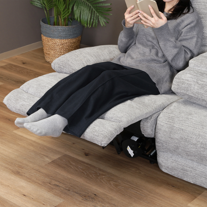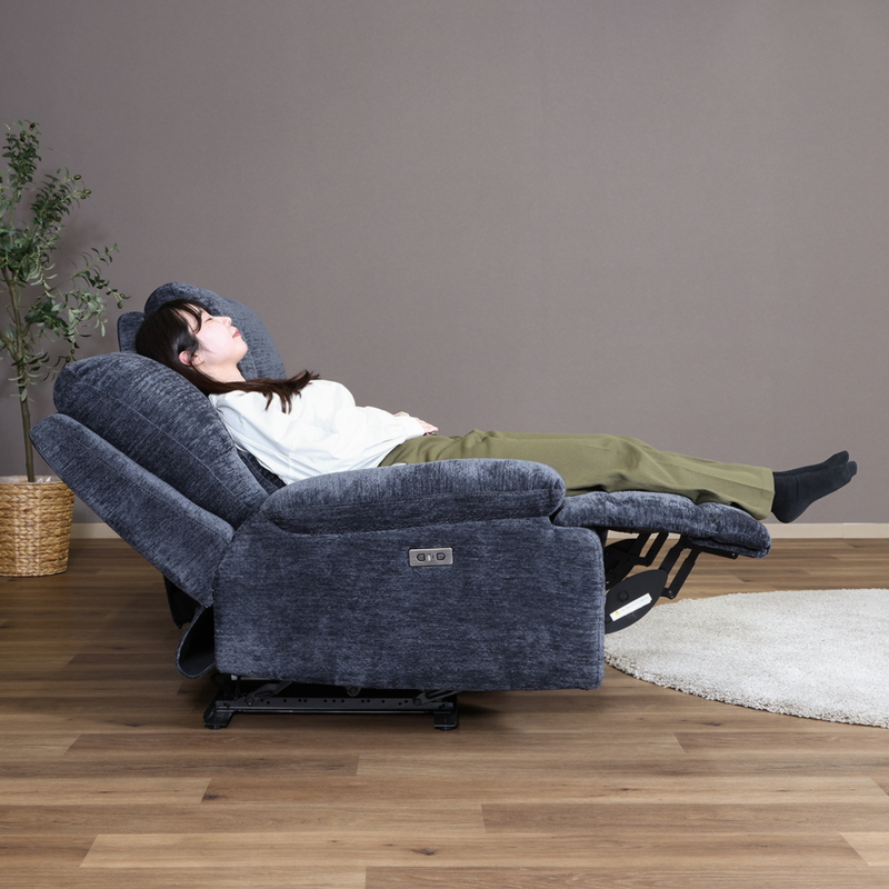 背もたれに連動してフットレストが持ち上がり、全身くつろぎモードに。