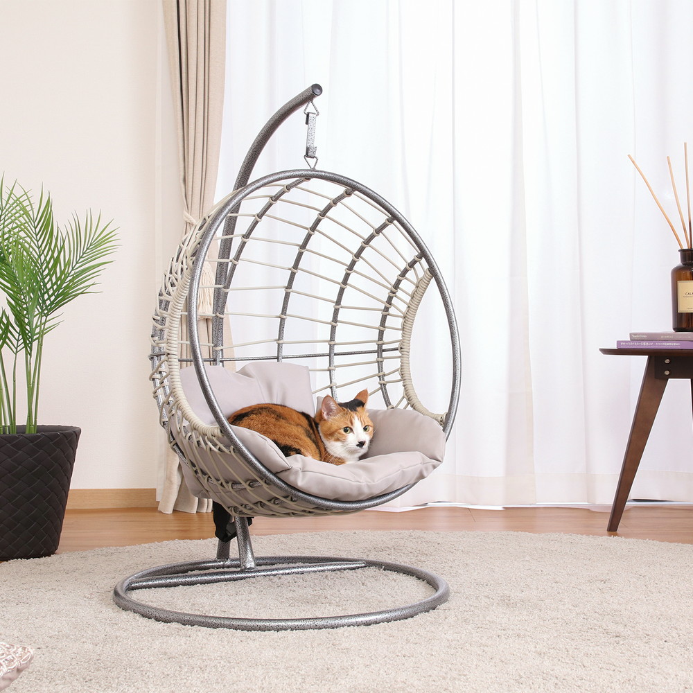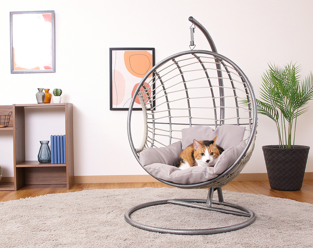 程よい揺れを楽しめるハンギングチェアはペットにとっても癒しのアイテム。専用のリラックス空間を堪能できます。