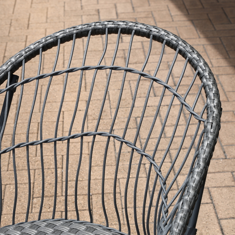 フレームには高級感のある樹脂ラタンを丁寧に編み込み、見た目も肌ざわりも上質。背もたれ部分のコードは、体をゆったり支 えてくれます。