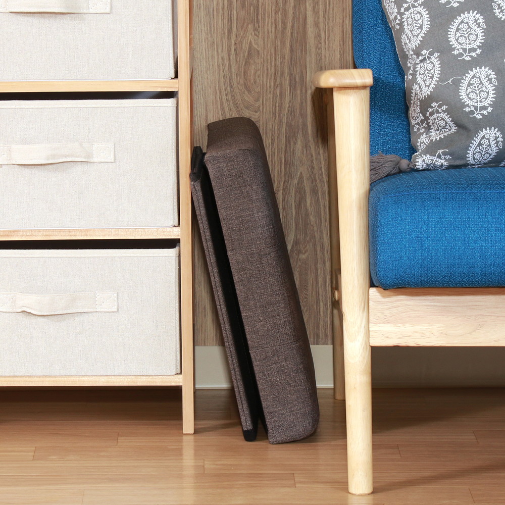 開いた本体に底板とクッションを入れて蓋(座面)をのせるだけ!使わない時は折りたたんで、厚さ8cmまでコンパクトに!