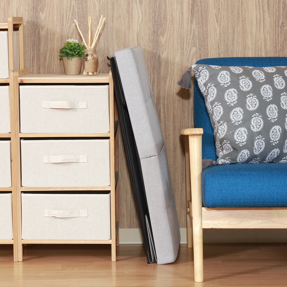 開いた本体に底板とクッションを入れて蓋(座面)をのせるだけ!使わない時は折りたたんで、厚さ9cmまでコンパクトに!