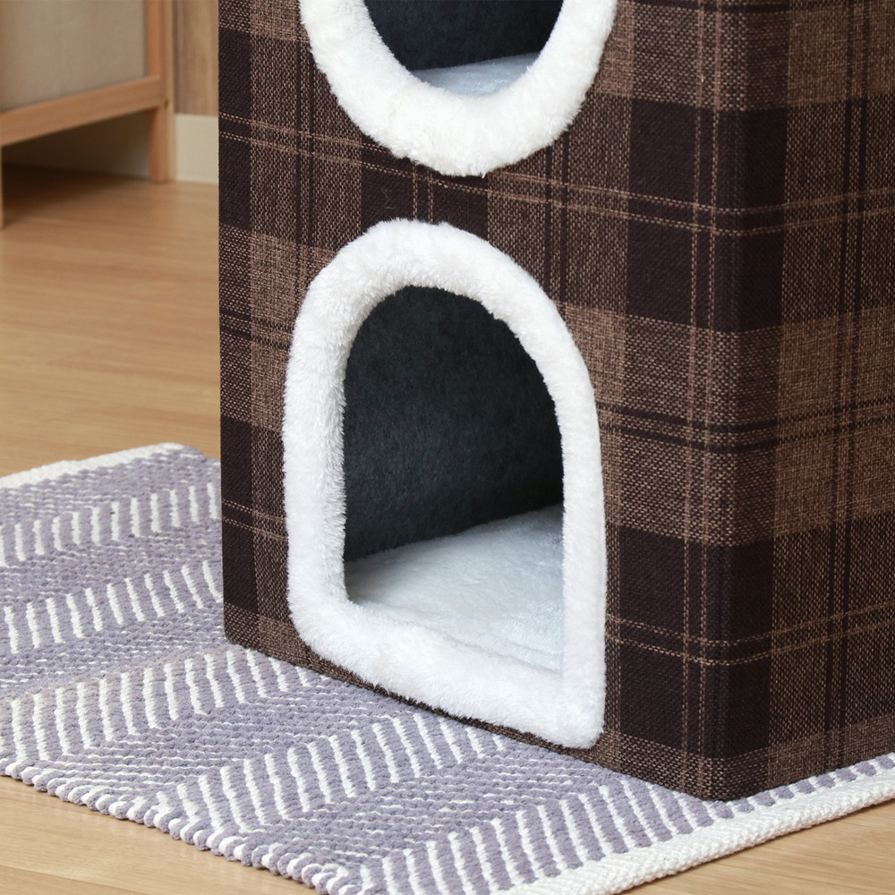 気持ちよさが伝わるもこもこのホワイトボアがアクセントのペットハウス。2階建てのおうちのようなデザインがかわいい!