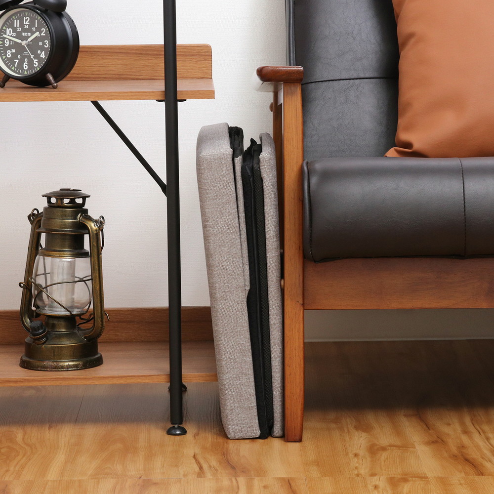 開いた本体に底板とクッションを入れて蓋(座面)をのせるだけ!使わない時はステップ部分もきれい折りたため、厚さ10cmまでコンパクトに!