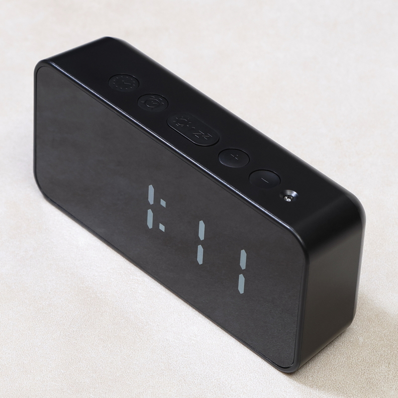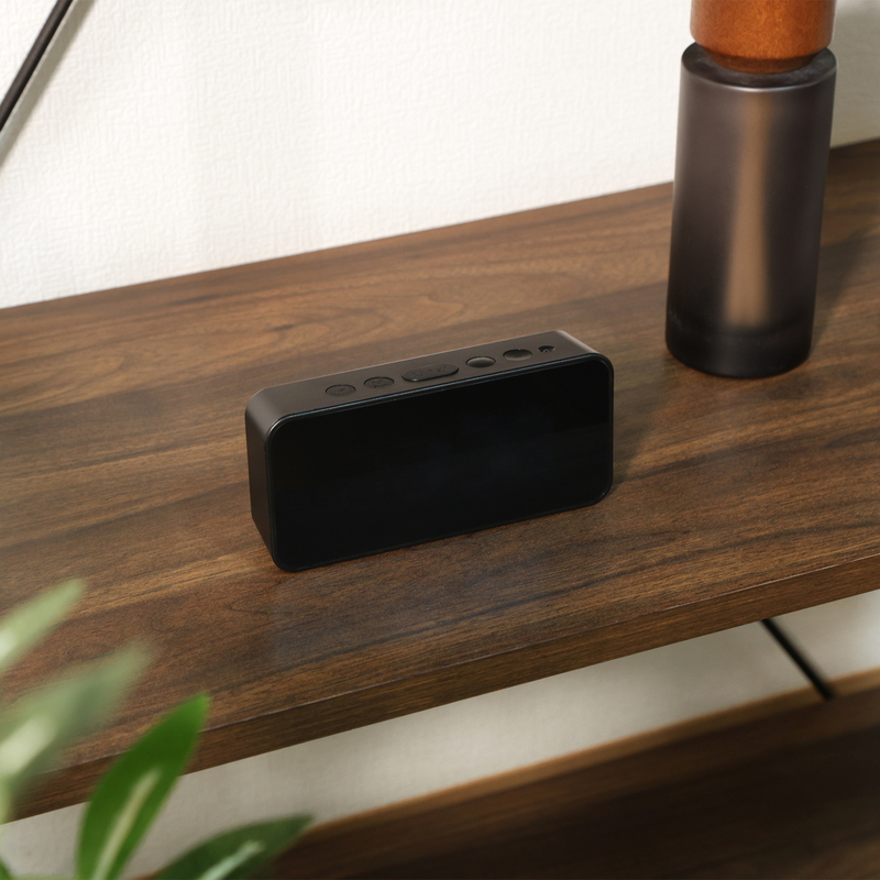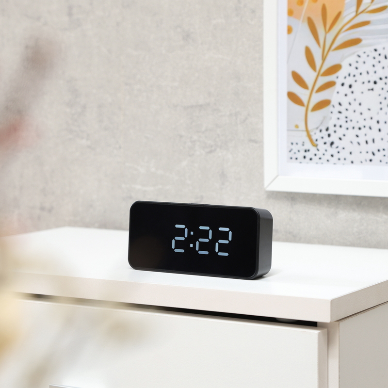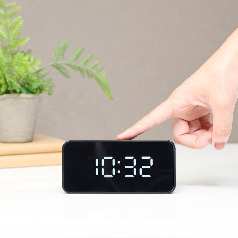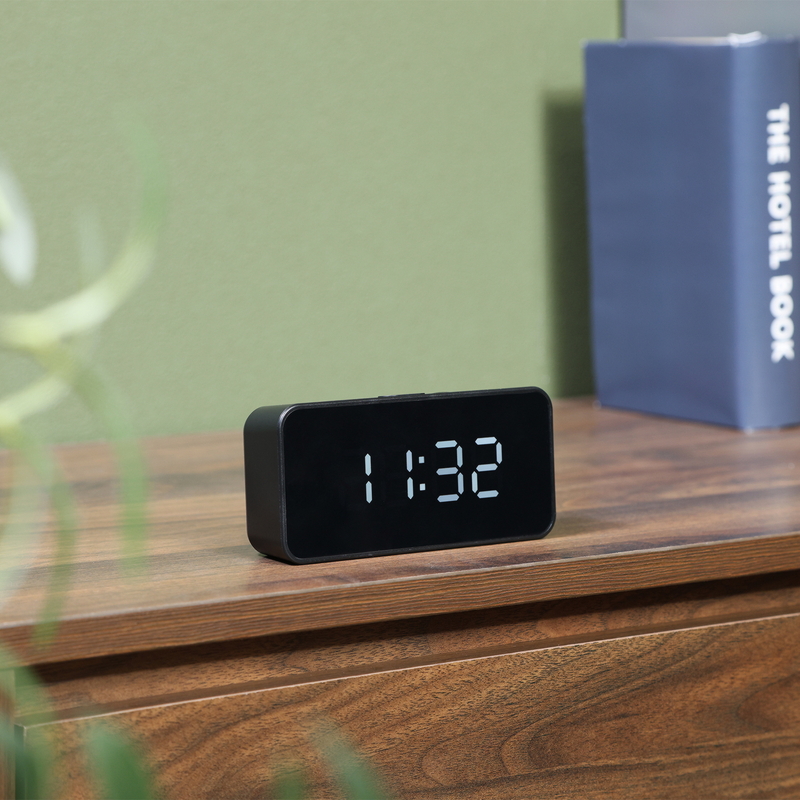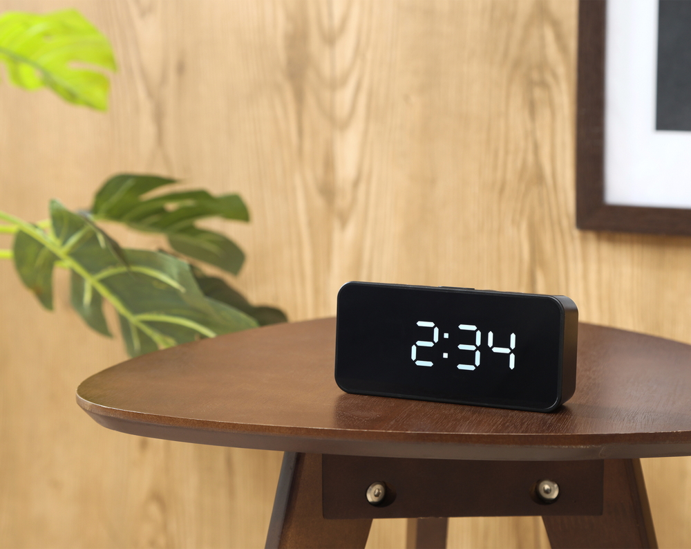 黒い本体に時間が白く浮かび上がる、おしゃれなデジタル置き時計