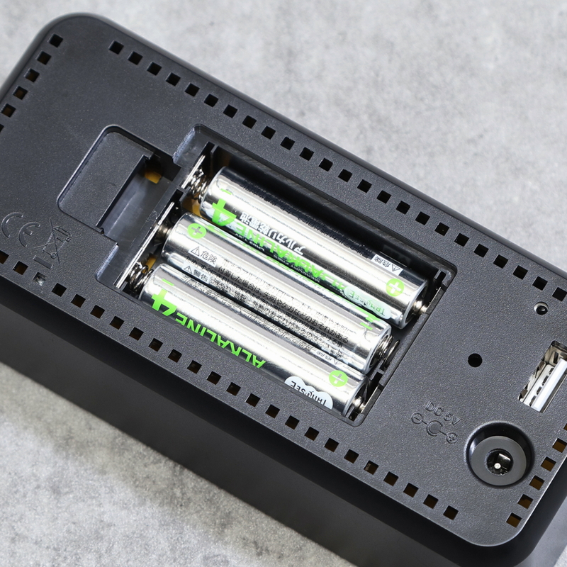 ブラックにホワイトのLEDで時間が表示されるため、離れた場所からでも見やすい!電池の場合は一定時間で表示が消え、USBケーブルを接続すると点灯し続けます。