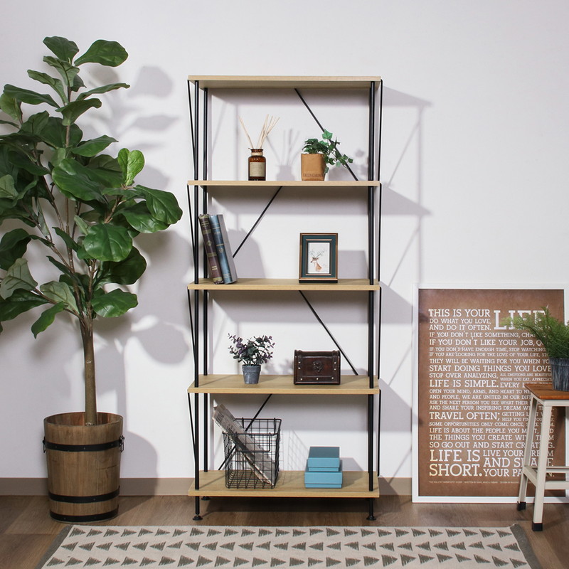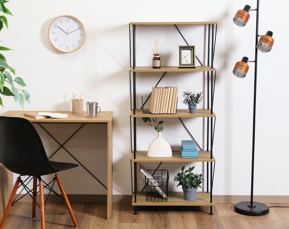 木目調の棚板とブラックスチールのワイヤーフレームで、空間をカッコよく見せてくれます。また、斜めにつけるスチールはお好みの位置に付けることができます。