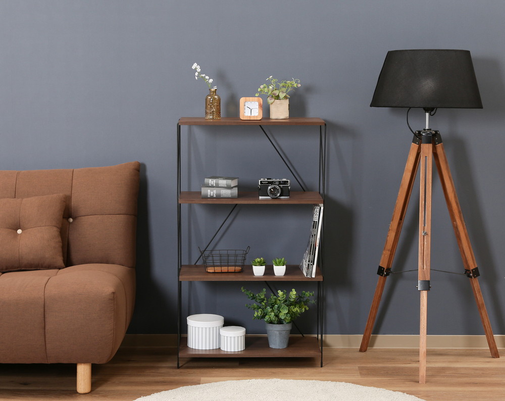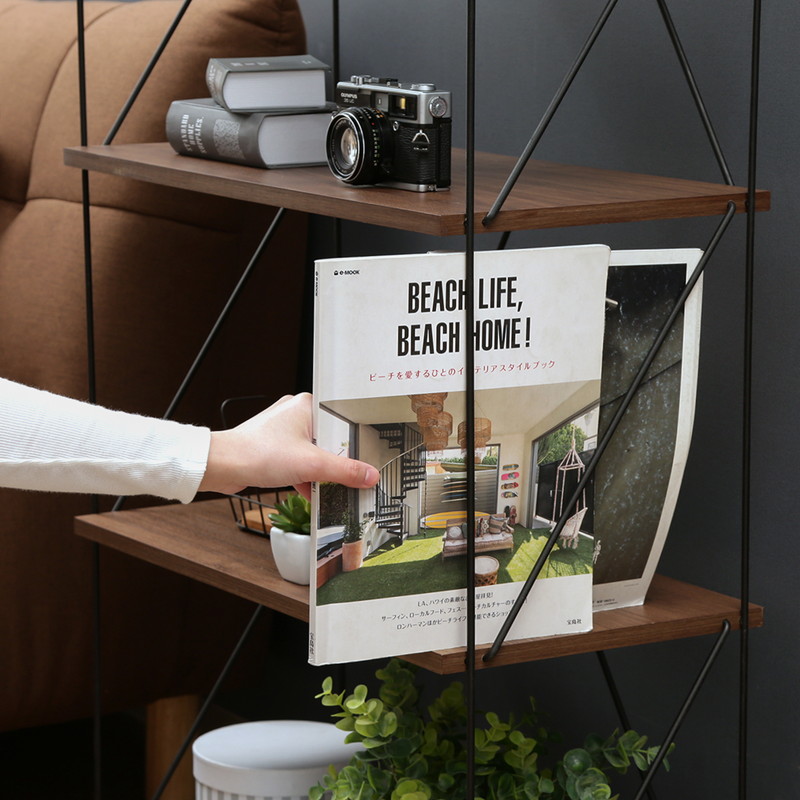 木目調の棚板とブラックスチールのワイヤーフレームで、空間をカッコよく見せてくれます。また、斜めにつけるスチールはお好みの位置に付けることができます。