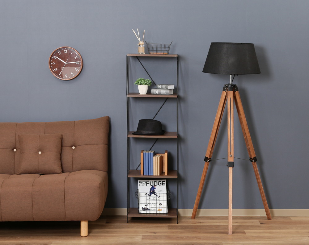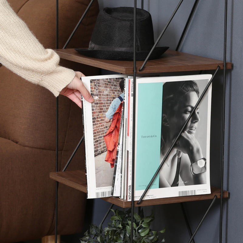 木目調の棚板とブラックスチールのワイヤーフレームで、空間をカッコよく見せてくれます。また、斜めにつけるスチールはお好みの位置に付けることができます。