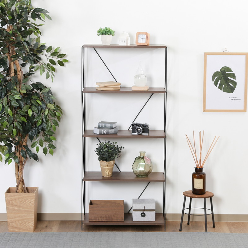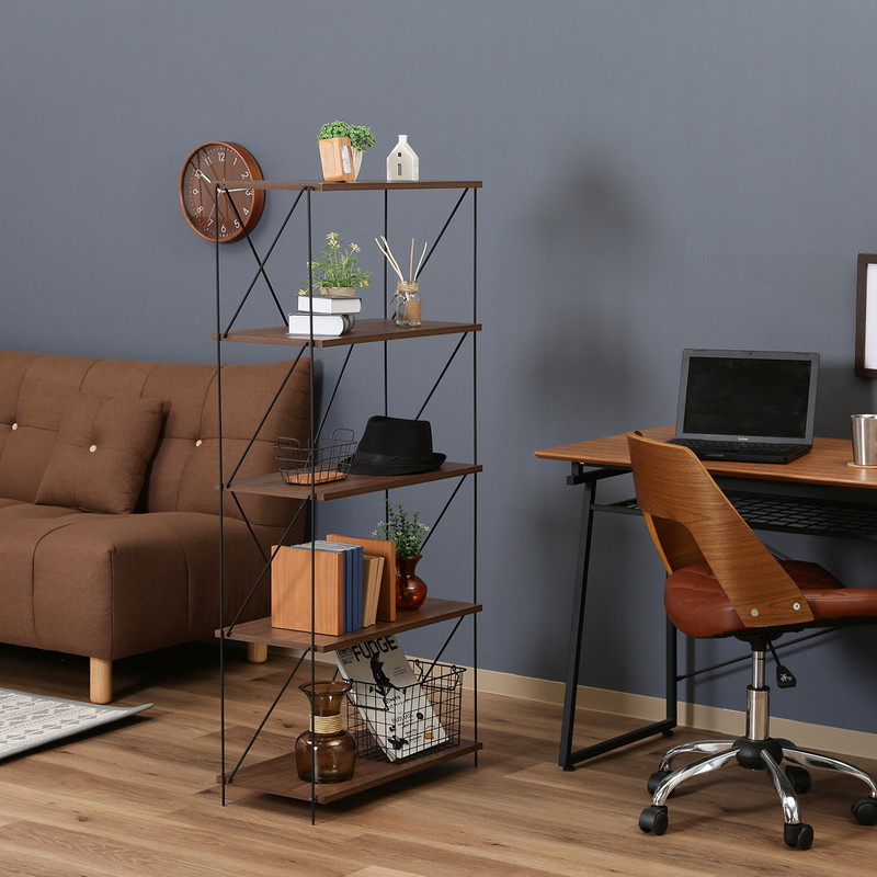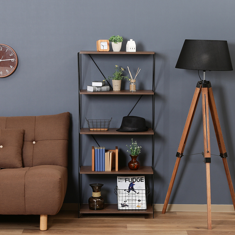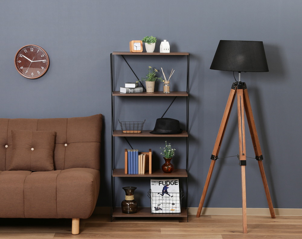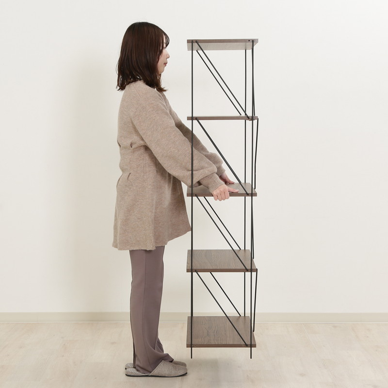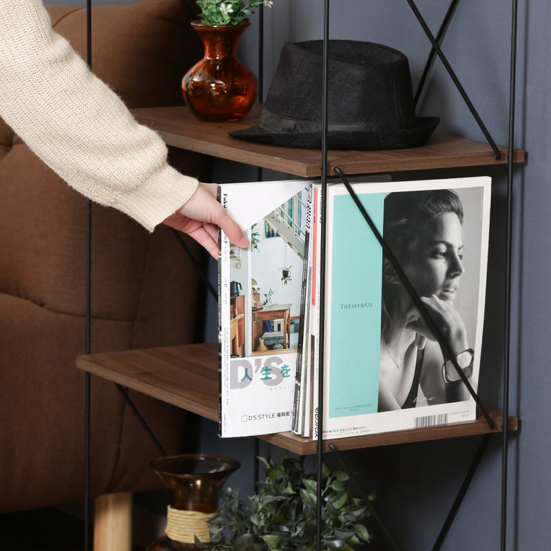 木目調の棚板とブラックスチールのワイヤーフレームで、空間をカッコよく見せてくれます。また、斜めにつけるスチールはお好みの位置に付けることができます。