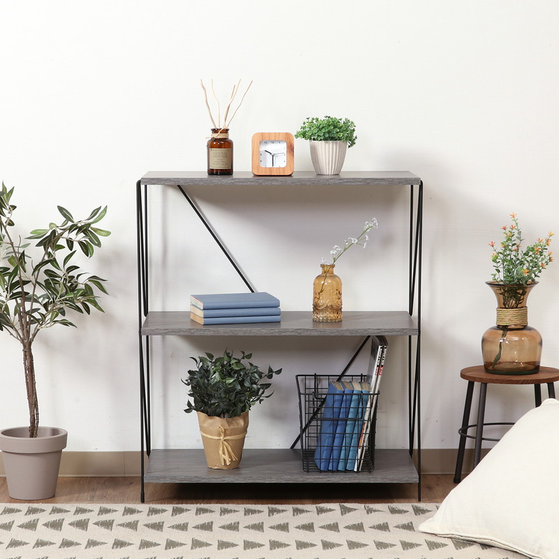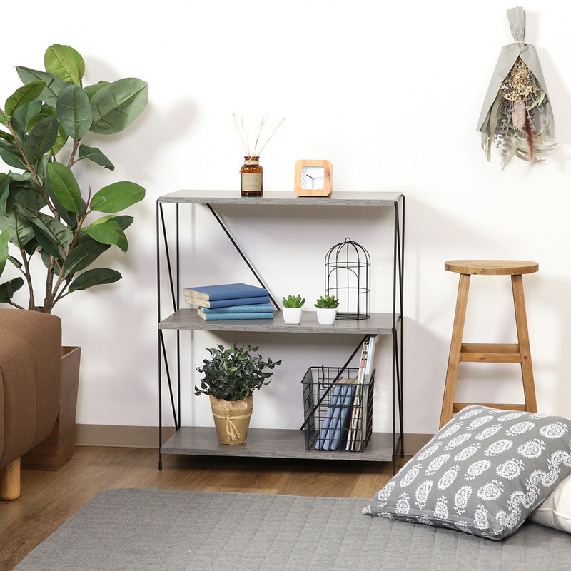 木目調の棚板とブラックスチールのワイヤーフレームで、空間をカッコよく見せてくれます。また、斜めにつけるスチールはお好みの位置に付けることができます。
