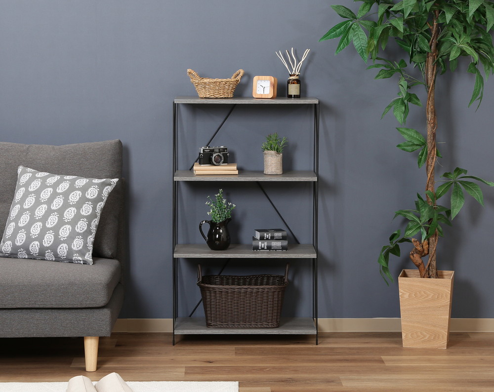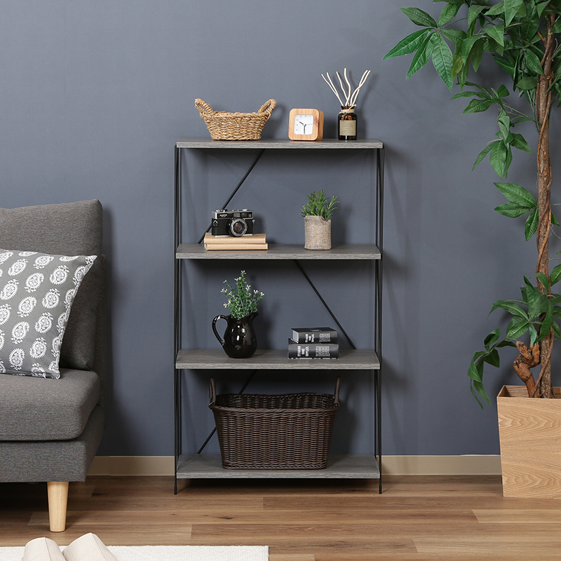 木目調の棚板とブラックスチールのワイヤーフレームで、空間をカッコよく見せてくれます。また、斜めにつけるスチールはお好みの位置に付けることができます。