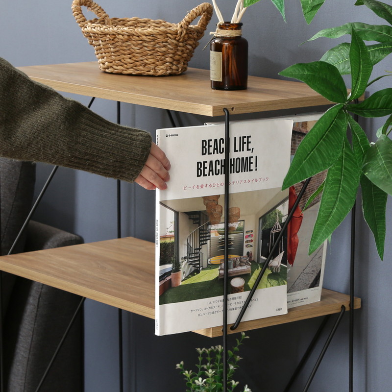 木目調の棚板とブラックスチールのワイヤーフレームで、空間をカッコよく見せてくれます。また、斜めにつけるスチールはお好みの位置に付けることができます。