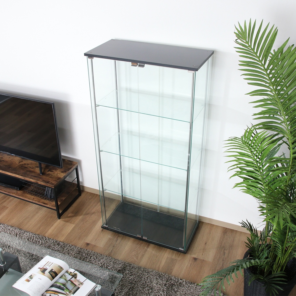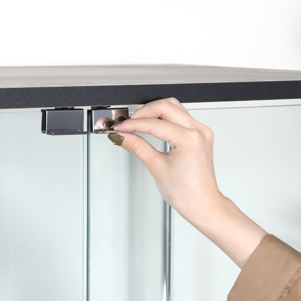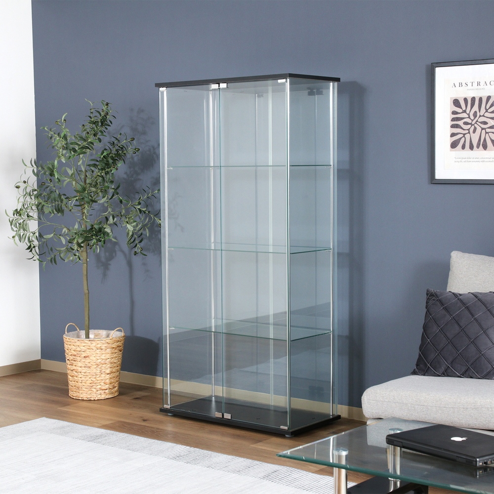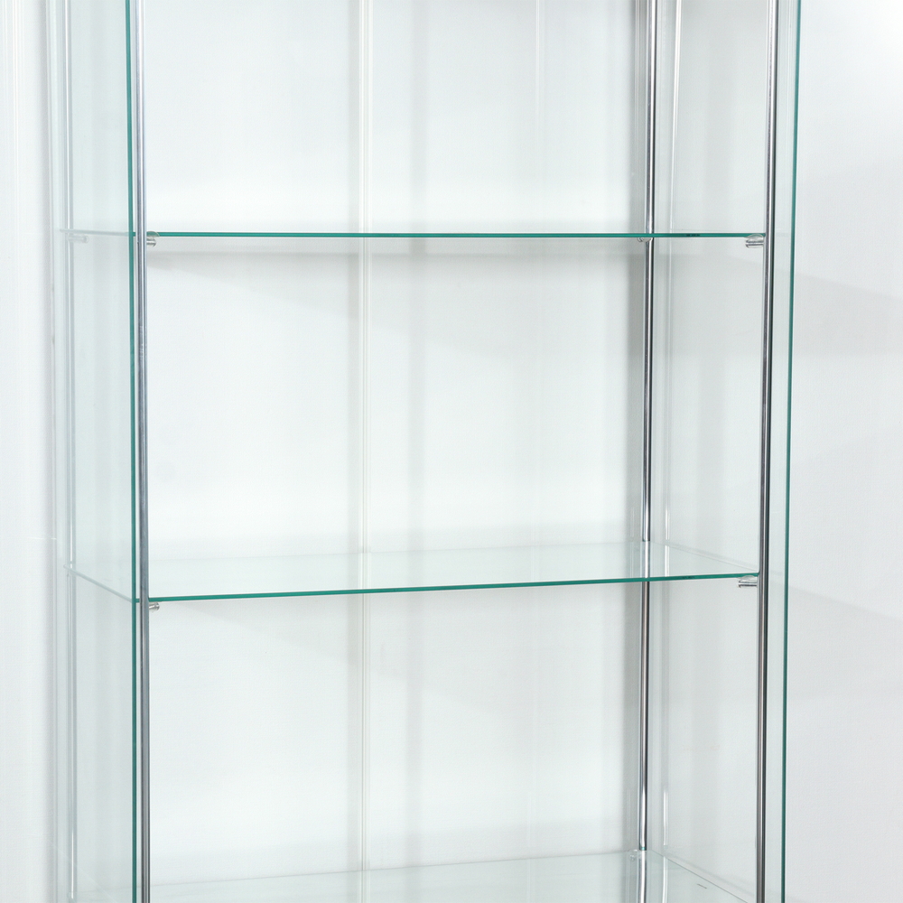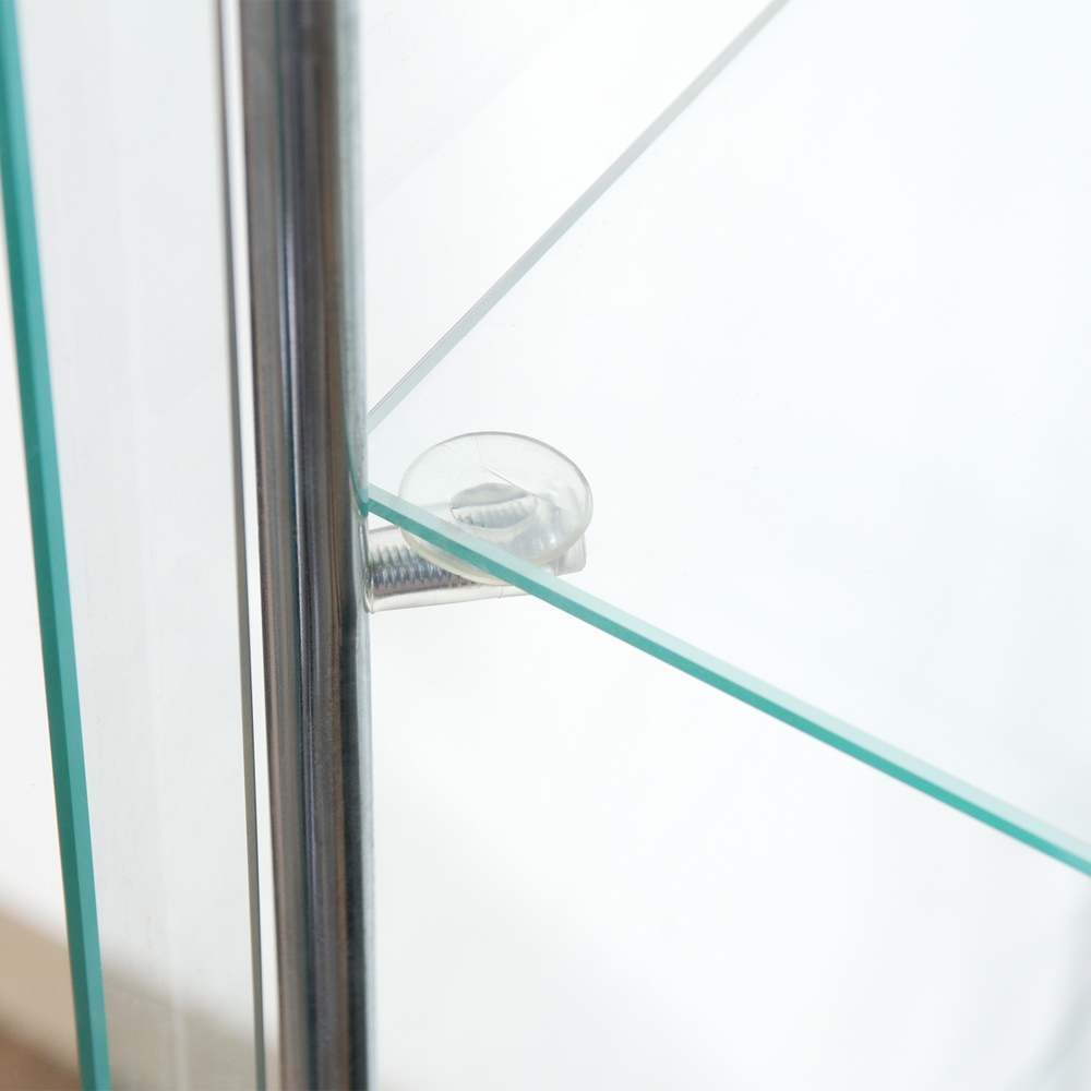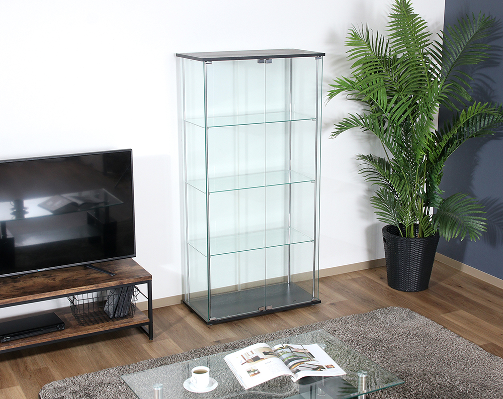 【素材・材質】 天板・地板:プリント紙化粧繊維板 / 構造部材(棚板・側板・扉板):強化ガラス / 構造部材(柱部):金属(鋼)[めっき(クロム)]