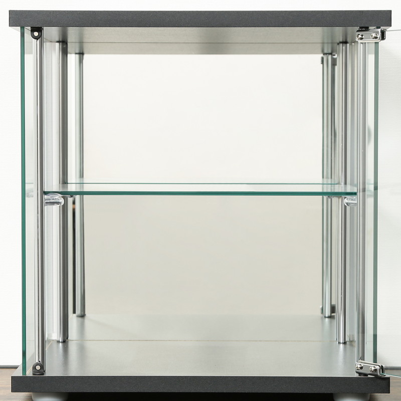【材質】■構造部材(天板/地板):プリント紙化粧繊維板 ■構造部材(柱):金属(鋼) ■構造部材(扉板/背板/側板/棚板):強化ガラス ■表面加工(柱):めっき(クロム)