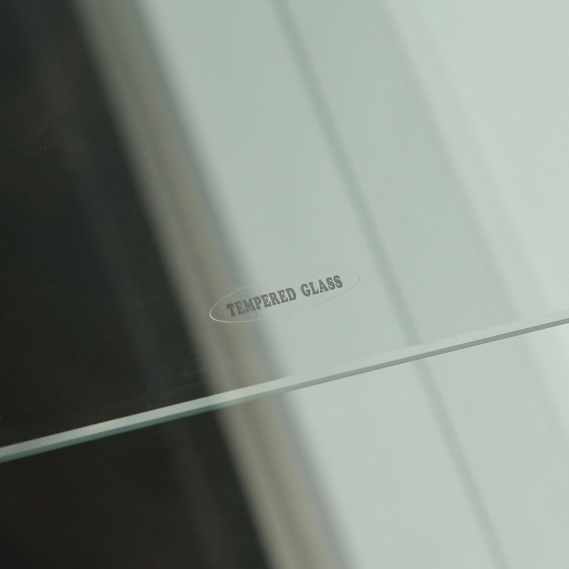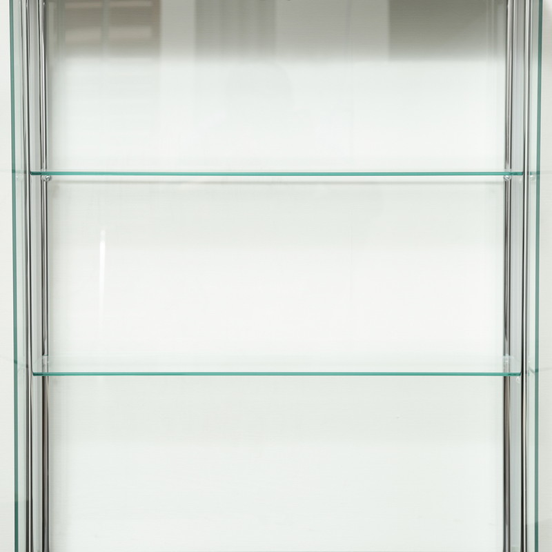 【材質】■構造部材(天板/地板):プリント紙化粧繊維板 ■構造部材(柱):金属(鋼) ■構造部材(扉板/背板/側板/棚板):強化ガラス ■表面加工(柱):めっき(クロム)